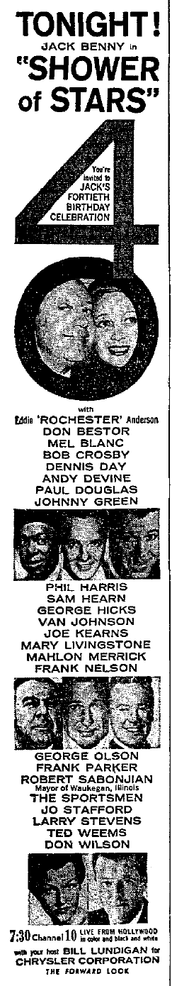 Scheduled to be on hand for the CBS-TV “Shower of Stars” are announcers Paul Douglas and George Hicks, who preceded Don Wilson, Singers Frank Parker, Dennis Day, Larry Stevens and Jo Stafford will be there along with orchestra leaders Bob Crosby, Abe Lyman, Phil Harris, Ted Weems, Don Bestor, Johnny Green and George Olson, Mel Blanc, Andy Devine, the Sportsman Quartette and a score of other Benny regulars, past and present, will help cut the birthday cake.