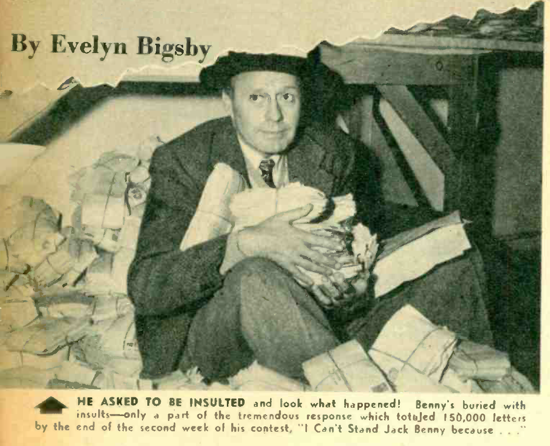 A few weeks ago Benny pulled another switch. This time, instead of conducting a contest on “I like Crunchy Munchies (or) Soapsy Sudsies (or) Itsy Bitsies in fifty words or less together with a box top or reasonable facsimile” contest, he launched a “Why I Can’t Stand Jack Benny” deal with no tops, no wrappers, no facsimiles—no, not even a strand from a 1945 model Benny toupe. It was a contest to satirize all contests, an insult routine to end all insult routines.